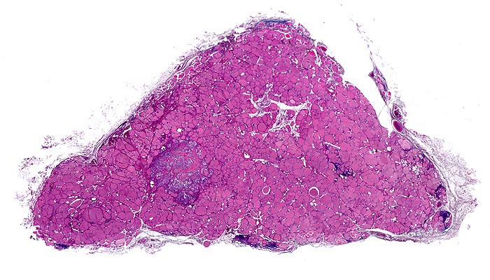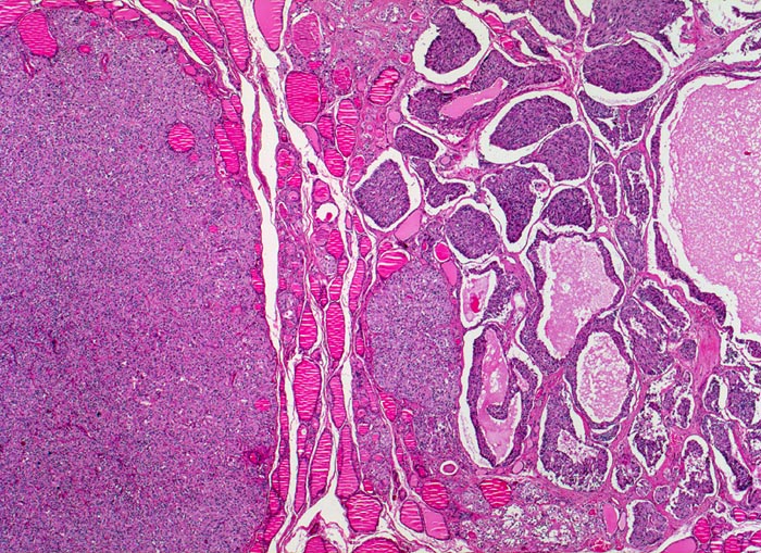• Mehrere, unscharf begrenzte, unbekapselte Tumorknoten mit desmoplastischem Stroma in ansonsten unauffälligem Schilddrüsenparenchym.