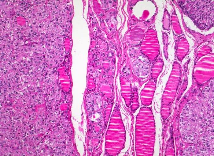 • Mehrere Herde hyperplastischer C-Zellen im nicht-neoplastischen Schilddrüsenparenchym als möglicher Hinweis auf ein hereditäres medulläres Schilddrüsenkarzinom.