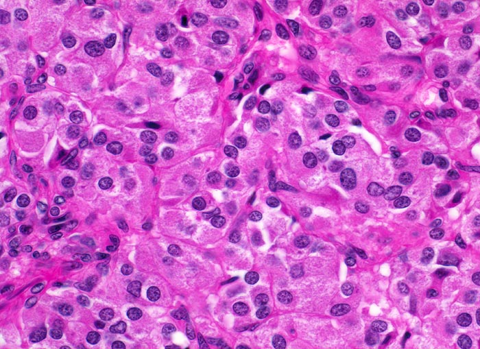 • Tumorzellen mit überwiegend monomorphen Zellkernen mit feinkörnigem Pfeffer und Salz Chromatin (Merkmal endokriner Zellen). Nukleolen sind nicht prominent. Reichlich eosinophiles Zytoplasma.