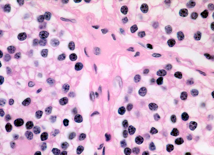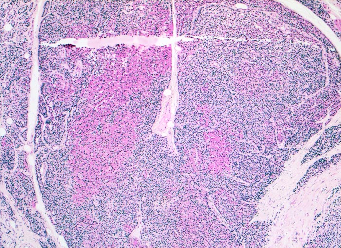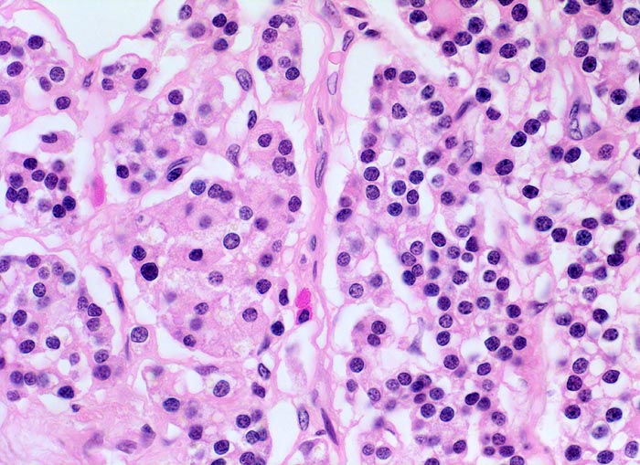 Anmerkung: Zur korrekten Beurteilung einer Nebenschilddrüsenpathologie ist der Pathologe auf klinische Angaben angewiesen (primärer oder sekundärer Hyperparathyreoidismus, eine oder mehrere Drüsen betroffen). Während früher der intraoperative Gefrierschnitt mit dem Minimalziel des Nachweises oder Ausschlusses einer pathologisch veränderten Nebenschilddrüse durchgeführt wurde, dient er heute praktisch ausschließlich der Identifikation von Nebenschilddrüsengewebe. Bei Operationen an der Nebenschilddrüse sollte heute anhand der modernen präoperativen Diagnostik bereits feststehen, ob eine Ein- oder Mehrdrüsenerkrankung vorliegt. Entscheidend für das Ausmass der Operation ist die intraoperative Bestimmung des Parathormonwertes. Bei Bestehen einer Ein-Drüsen-Erkrankung wird nur die betroffene Drüse entfernt. Ohne klinische Angabe kann der Pathologe in solchen Fällen ein Adenom nicht sicher von einer Hyperplasie unterscheiden.