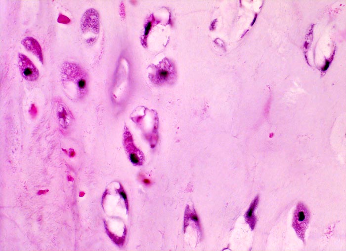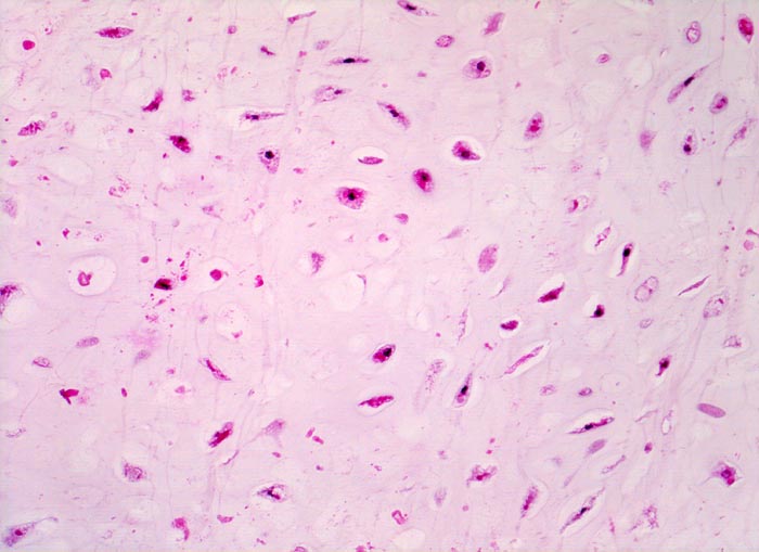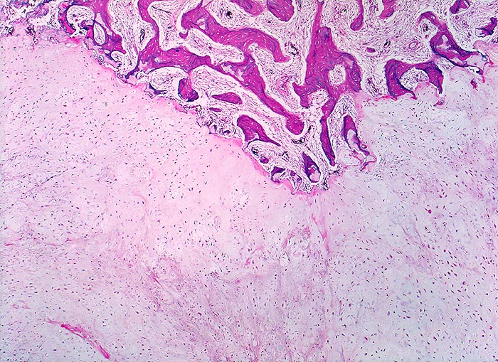 • Der maligne Knorpel mit reichlich heller chondroider Matrix gleicht nicht neoplastischem hyalinem Knorpelgewebe.