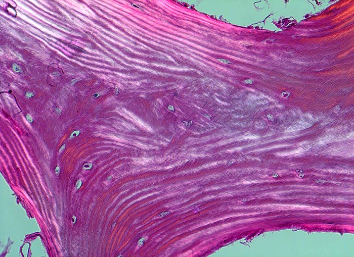 • Der Tumor besteht aus neugebildetem bereits verkalktem Knochen oder einem Netzwerk von primitiven Osteoidtrabekeln. Entlang oder innerhalb der Osteoidtrabekel lokalisierte polymorphe Tumorzellen mit ausgeprägten Kernatypien und zahlreichen Mitosen. Leicht verwaschene Kernstrukturen als Folge der Gewebsentkalkung.