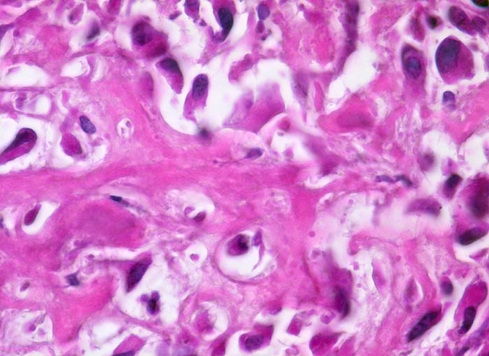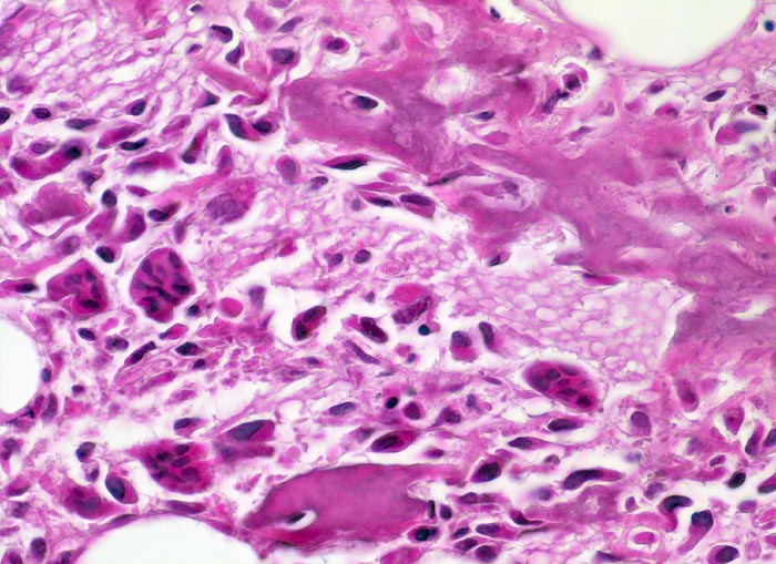 Das histologische Bild kann deutlich variieren. Der Tumor kann beispielsweise nur ganz fokal Osteoid produzieren und ansonsten wie ein undifferenziertes pleomorphes Sarkom aussehen, er kann aber auch massenhaft Knorpelmatrix bilden und/oder Riesenzellen enthalten. Der Nachweis von neoplastischem Osteoid ist entscheidend in der Abgrenzung von anderen Sarkomtypen.