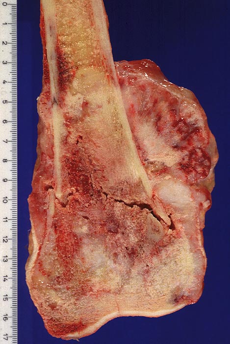 • Der Tumor hat die Korticalis destruiert und infiltriert die angrenzende Skelettmuskulatur.