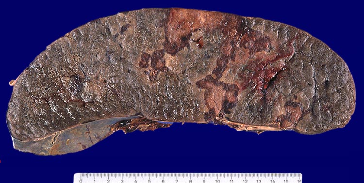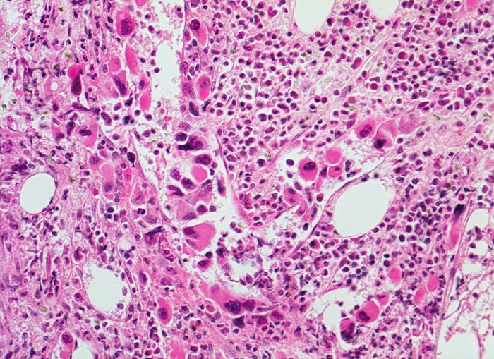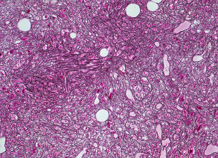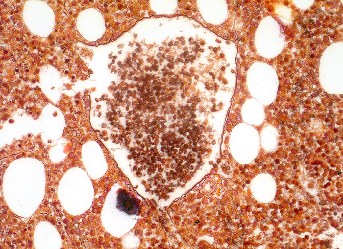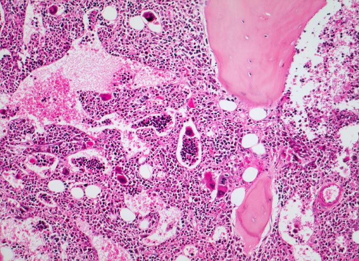 Die Erkrankung ist charakterisiert durch Knochenmarkfibrose, Hepato-Splenomegalie und extramedulläre Blutbildung. Diese findet sich am häufigsten in Leber und Milz, seltener in Lymphknoten, Nieren, Nebennieren, Dura mater, Gastrointestinaltrakt, Lunge, Mamma oder Haut. Blut und Knochenmark sind immer involviert. Die Krankheit entwickelt sich über ein initiales präfibrotisches Stadium mit hyperzellulärem Knochenmark zum fibrotischem Stadium (vorliegendes Präparat). Das fibrotische Stadium ist gekennzeichnet durch eine Vermehrung von Reticulin- und/oder Kollagenfasern und oft einer Knochenneubildung (=Osteomyelosklerose). Die Zellularität des Knochenmarks ist dann vermindert und dilatierte Marksinus enthalten intraluminale Blutbildungsherde. Es besteht eine auffallende Proliferation von Gruppen bildenden atypischen Megakaryozyten.