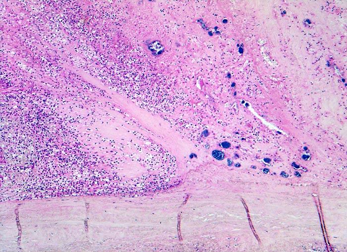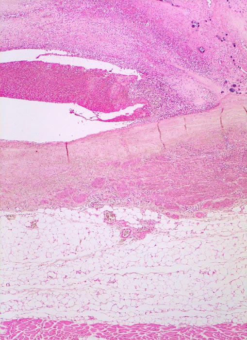 Histologisch findet sich bei ulzeropolypöser Endokarditis ein Fibrin-Thrombozytenthrombus, welcher von Bakterien durchsetzt ist (=Vegetation). Die Vegetation sitzt auf einem Klappendefekt an dessen Basis Granulationsgewebe einzusprossen beginnt, welches den Thrombus organisiert. Klappendefekte, Gefässeinsprossungen, verdickte Sehnenfäden ( 2848) oder Kommissurenverwachsungen ( 8389) der Taschenklappen weisen morphologisch auf eine abgeheilte Endokarditis hin.