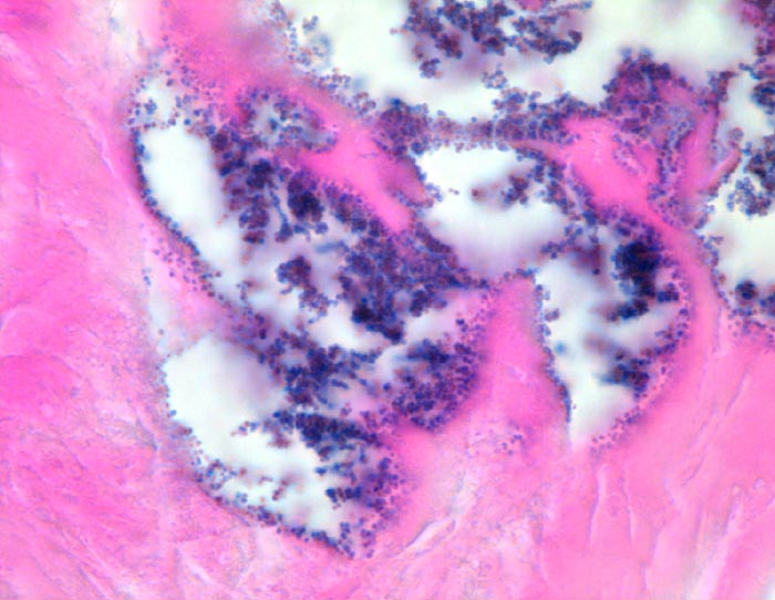 Dem ulzerierten Klappengerüst aufgelagerte polypöse Vegetation aus Fibrin und Granulozyten durchsetzt von blauen Kokkenbakterienkolonien (polyposa).