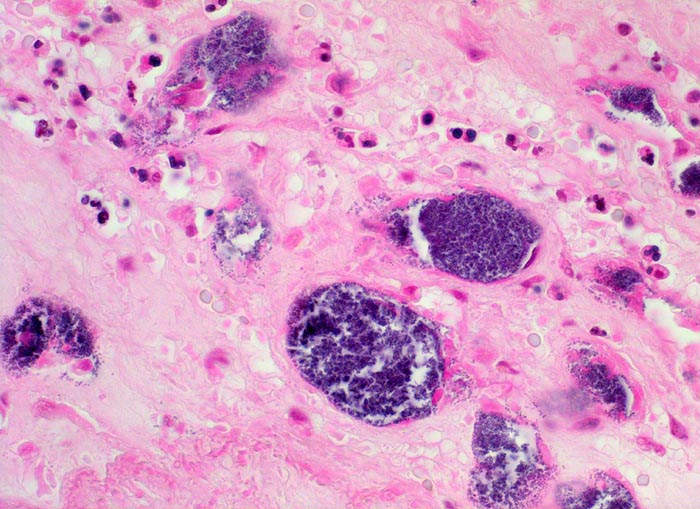 Mehrere septikopyämische Streuherde (blaue Bakterienhaufen in intramyokardialen Blutgefässen umgeben von Mikroabszessen).