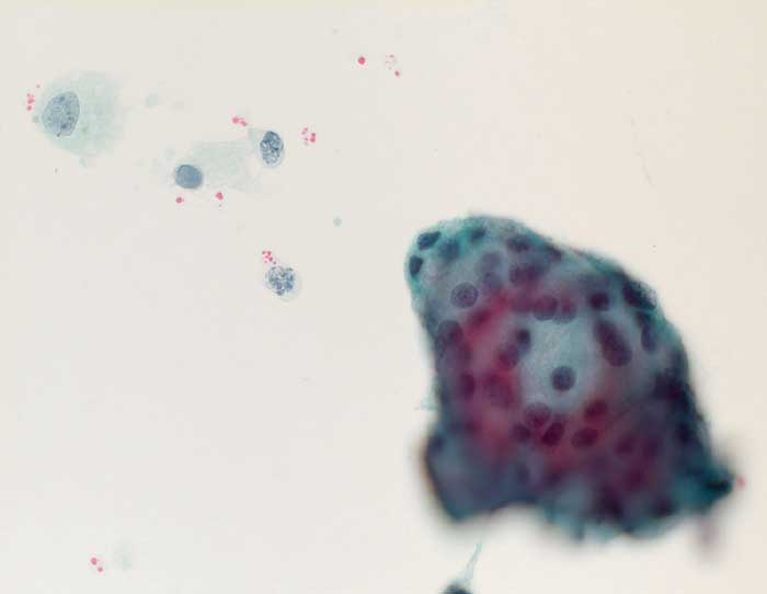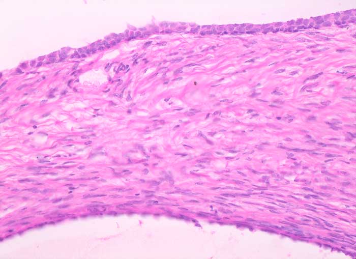 Der Ausstrich ist zellarm. Die Epithelien sind kubisch bis niedrig-zylindrisch und einzeln oder in flach ausgebreiteten Verbänden gelagert. Die Zellgrenzen sind weniger scharf als beim muzinösen Zystadenom. Die Kerne sind rund und das Chromatin ist fein granulär. Nukleolen sind klein oder fehlen. Das Zytoplasma enthält keinen Schleim und ist nicht vakuolisiert. Der apikale Zellrand trägt Zilien, was das seröse Zystadenom von Granulosazellen einer Follikelzyste unterscheidet. Die Zystenflüssigkeit enthält neben Epithelzellen Schaumzellen, Hämosiderin und ältere Blutbestandteile.