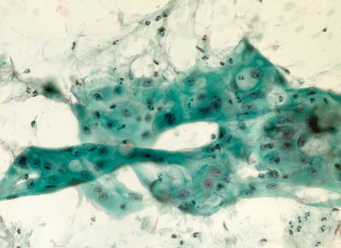 Die schwersten Veränderungen treten in Zellen der proliferationsaktiven tiefen Schichten des Vaginalepithels auf. Die Plattenepithelien sind stark vergrössert, wobei im Unterschied zu neoplastischen Veränderungen die Kern-Zytoplasma Relation unverändert ist. Je nach Schweregrad der Strahlenwirkung entwickeln sich Kernschwellung, Riesenkerne, Kernvakuolen, Kernmembranfalten, Pyknosen, Karyolyse und Karyorhexis. Doppel- und Mehrkernigkeit kommt vor allem in Zellen der tieferen Schichten vor. Das Zytoplasma enthält oftmals zahlreiche unterschiedlich grosse Vakuolen. Radiogene Atypien können über viele Jahre unverändert persistieren.