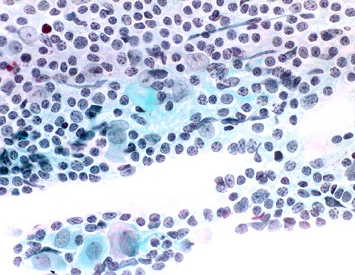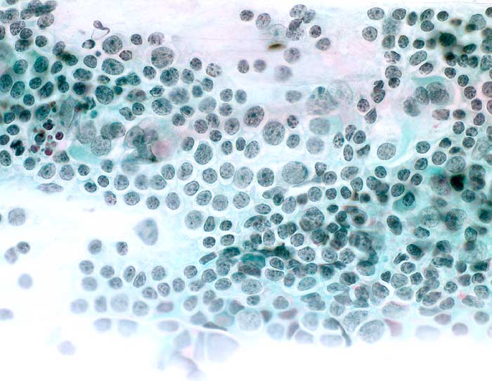Möglicherweise besteht bei dieser speziellen Form der Zervizitis eine Assoziation mit Chlamydieninfektionen. Die Entzündung ist durch ein dichtes lymphozytäres Infiltrat mit grossen Follikeln und hyperplastischen Keimzentren charakterisiert. Die Ausstriche enthalten entsprechend zahlreiche einzeln liegende kleine und grosse Lymphozyten, Keimzentrumszellen und Kerntrümmermakrophagen. Die Entzündungszellen kommen bevorzugt im endozervikalen Abstrich vor, wo sie im Zervixschleim typische Zellstrassen bilden.