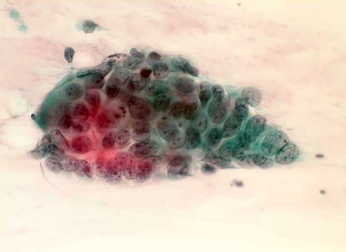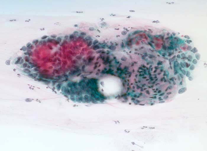Die Ausstriche des ACIS sind zellreich und enthalten atypische Zylinderzellen mit grossen Kernen. Diese bilden flache Verbände, die in der Aufsicht ein Honigwabenmuster, bei seitlicher Betrachtung ein Palisadenmuster und eine Pseudostratifikation der Kerne erkennen lassen. Die Kerne sind im Vergleich zum normalen Zylinderepithel deutlich grösser und enthalten einen vergrösserten Nukleolus. Eine Hyperchromasie ist nicht immer vorhanden und das granuläre Chromatin ist regelmässig verteilt. Der zytologische Nachweis von atypischen Zylinderepithelien sollte histologisch weiter abgeklärt werden.