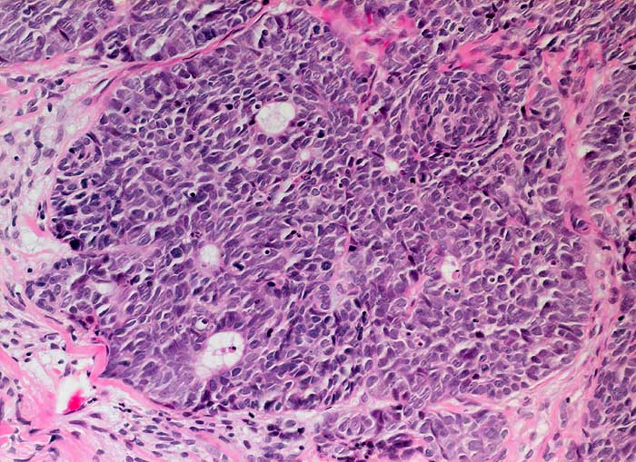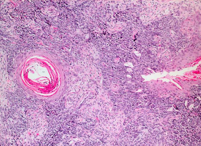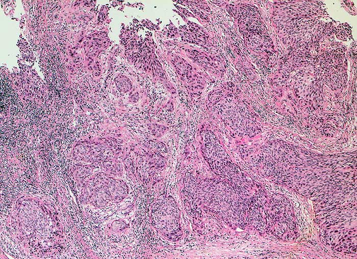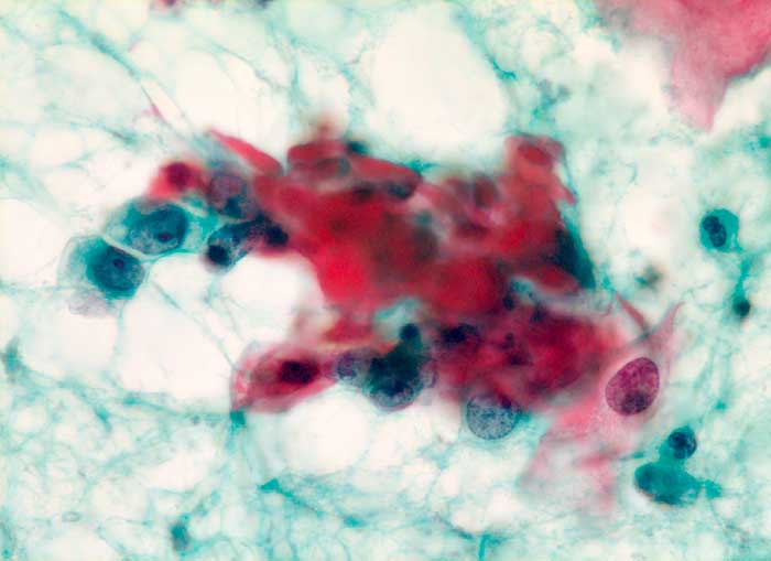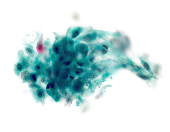 Die Tumorzellen liegen einzeln oder in kleinen Verbänden und ganzen Gewebsfragmenten. Die polymorphen Kerne sind vergrössert und enthalten verklumptes unregelmässig verteiltes Chromatin und grosse Nukleolen. Gut differenzierte Karzinome erkennt man am breiten und oft verhornten Zytoplasma. Längliche bis fadenförmige Tumorzellen mit pyknotischen Kernen können als einziger Hinweis auf das Vorliegen eines Karzinoms vorhanden sein. Wenig differenzierte Karzinome haben polymorphe und schlechter erhaltene Kerne. Der Hintergrund ist meist detritisch und oft hämorrhagisch. Ulzeration, Einblutungen und bakterielle Infektionen beeinflussen den Erhaltungszustand und die Art der abgestrichenen Zellen. Ist die Oberfläche eines ulzerierten Karzinoms von einem Fibrinschorf bedeckt, enthalten die Ausstriche lediglich Detritus, Granulozyten und Erythrozyten, aber keine Tumorzellen. Die Sensitivität für die Karzinomdiagnose ist aus diesem Grund geringer als für die Diagnose eines Carcinoma in situ. Unten werden drei Fallbeispiele mit histologischer Korrelation gezeigt.