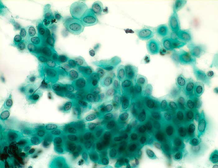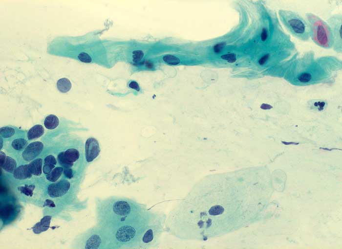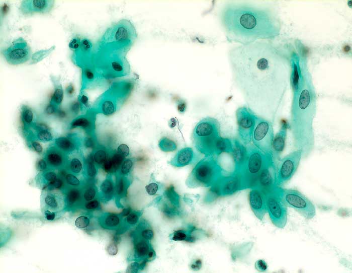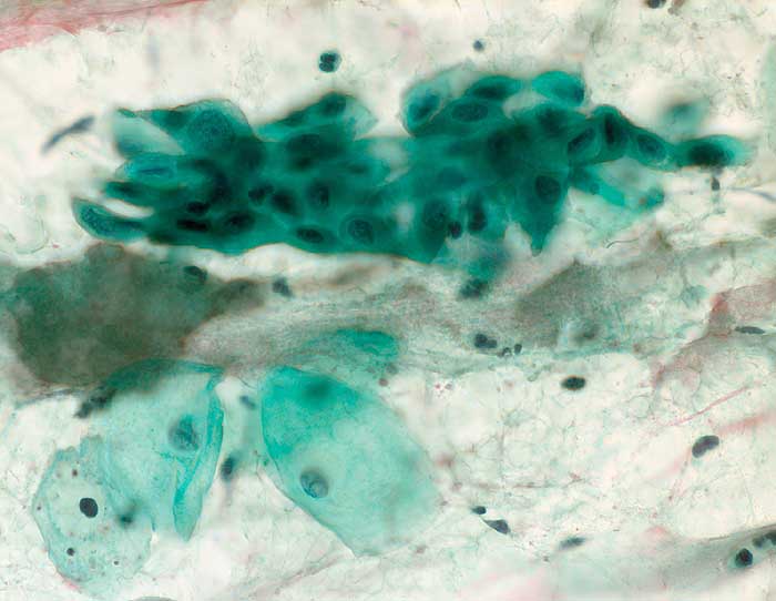Die Kategorie "atypical squamous cells of undetermined significance" der Bethesda Klassifikation umfasst entzündliche, reaktive und nicht klassifizierbare Plattenepithelveränderungen. Die Atypien übersteigen dabei das Mass gewöhnlicher reparativer Veränderungen. In den meisten Fällen sind reife Plattenepithelien betroffen. Nicht klassifizierbare Plattenepithelveränderungen können aber auch in metaplastischen oder atrophen Epithelien angetroffen werden. Die Diagnose ASCUS im atrophen Abstrich kann dann gestellt werden, wenn die Kerne mindestens zweimal so gross sind wie normal und eine deutliche Hyperchromasie zeigen, die Kernkontur bzw. Chromatinverteilung unregelmässig ist oder eine deutliche Pleomorphie in Form von Tadpole Zellen oder spindeligen Zellen vorhanden ist. In solchen Fällen kann nach einer kurzfristigen lokalen Östrogenbehandlung der Abstrich wiederholt werden. Gutartige atrophieassoziierte Veränderungen verschwinden unter Östrogentherapie. Signifikante präkanzeröse Läsionen persistieren hingegen und sind auf dem Hintergrund ausgereifter Zellen besser erkennbar.