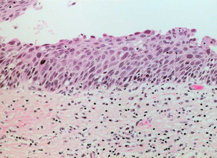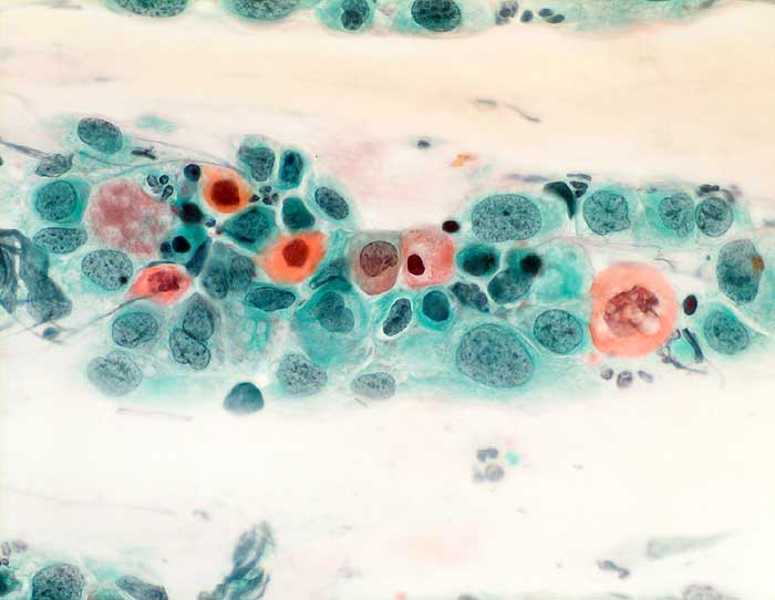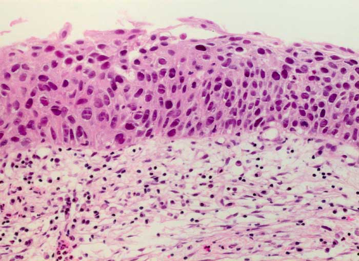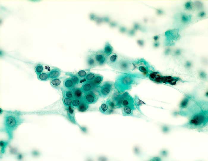 Die am wenigsten differenzierten Zellen der schweren Dysplasie entsprechen dem Basalzelltyp. Die Kerne sind grösser als bei der mässigen Dysplasie. Da die Zellen gleichzeitig kleiner sind, erhöht sich die Kern-Zytoplasma Relation deutlich zu Gunsten der Kerne. Die vergrösserten Chromatingranula sind durch bandförmige Chromatinverklumpungen miteinander verbunden. Dadurch entsteht ein typisches Siebmuster. Die Kernmembran ist unregelmässig verdickt und zeigt häufig auch tiefere Einkerbungen. Die zytologischen Bilder stammen von zwei verschiedenen Patientinnen.