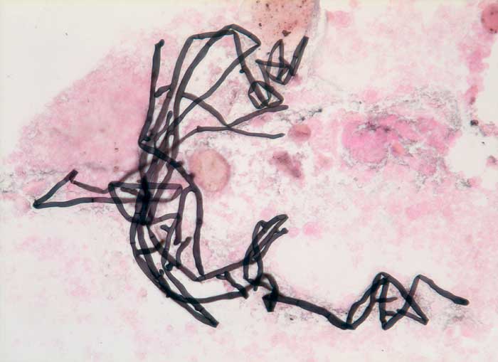 Aspergillen gehören in die Gruppe der Schimmelpilze und wachsen ubiquitär auf organischen Stoffen. Der Erreger ist charakterisiert durch echte septierte Hyphen von 3 bis 6 Mikrometer Durchmesser. Die Hyphen verzweigen sich in einem Winkel von 45 Grad. Selten sind auch die ( 10851)( 10849) Fruchtköpfe (Conidiophoren) nachweisbar. Aspergillusinfekte manifestieren sich je nach Resistenzlage als Aspergillom, invasive Aspergillose oder allergische Aspergillose. Der Nachweis von Aspergillus beweist noch nicht eine klinisch relevante Infektion.