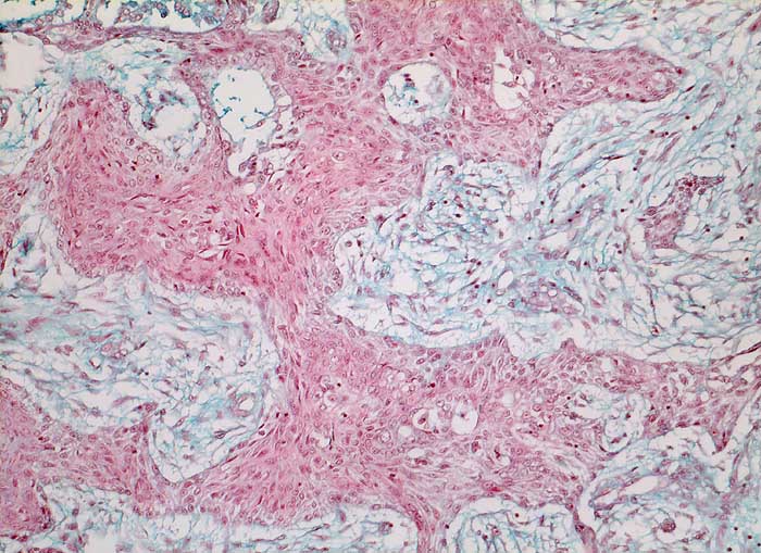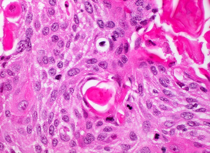 Die Abbildungen zeigen ein verhorntes und ein unverhorntes Plattenepithelkarzinom zum Vergleich.