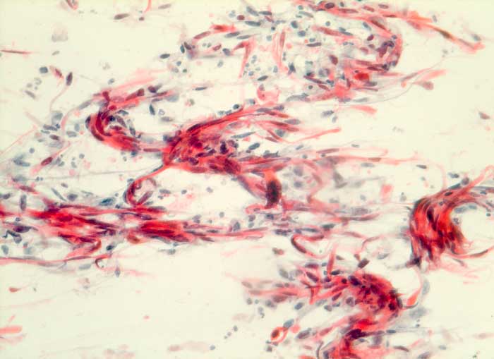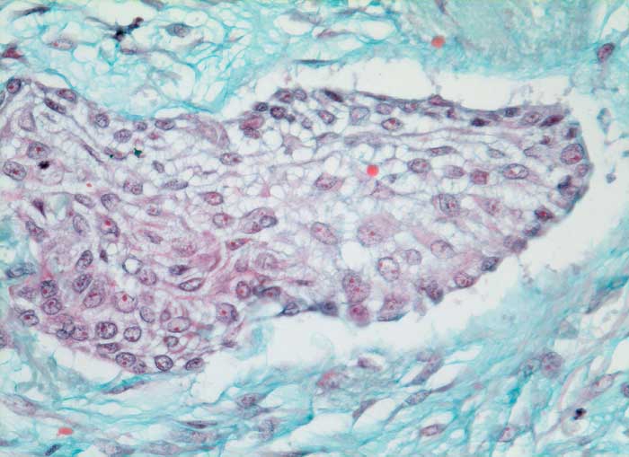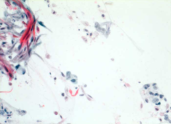 Verhornende Plattenepithelkarzinome sind charakterisiert durch mehr einzeln gelagerte Zellen mit deutlicher Pleomorphie, das Zytoplasma ist dicht und orangeophil. Die Kerne sind pyknotisch oder erinnern an Lavabrocken. Die häufigeren nicht verhornenden Plattenepithelkarzinome bilden eher Verbände. Die Tumorzellen sind uniformer, das dichte Zytoplasma ist blau-grün gefärbt und scharf begrenzt. Die Zellkerne sind hyperchromatisch und enthalten grosse Nukleolen. Die Abgrenzung des nicht verhornenden Plattenpithelkarzinoms vom Adenokarzinom kann schwierig sein. In der Regel ist das Kernchromatin der Plattenepithelkarzinome dichter und die Nukleolen weniger prominent.