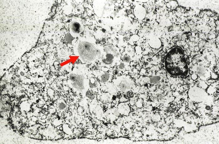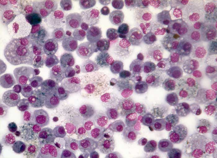 Das Antiarrhythmikum Amiodarone kann bei einem Teil der Patienten Lungeninfiltrate verursachen. Wichtigster Befund in der BAL ist eine Vermehrung der Makrophagen auf über 300x10^6/l. Viele Makrophagen sind zu Schaumzellen umgewandelt und am besten in der MGG Färbung an ihrem breiten fein vakuolären Zytoplasma erkennbar. Gleich aussehende Makrophagen werden auch im Pleuraerguss beobachtet. Daneben können Neutrophile, Eosinophile und Lymphozyten vermehrt sein. Die Makrophagen enthalten elektronenmikroskopisch darstellbare lamelläre Körperchen. Eine grosse Anzahl dieser Körperchen beweist einen Amiodaroneschaden.