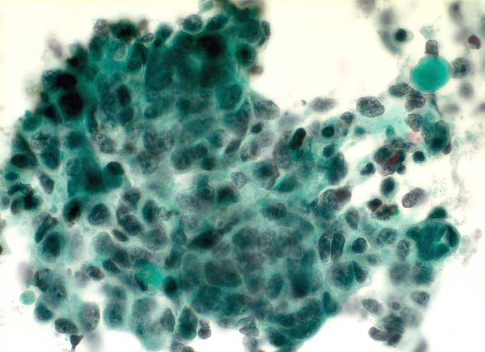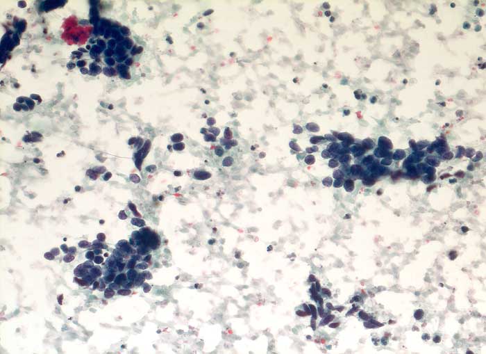 Die meisten Hirnmetastasen stammen von Karzinomen, wobei Mamma- und Bronchuskarzinome am häufigsten sind. Im Unterschied zu allen primären Hirntumoren bilden Karzinommetastasen Verbände. Am schwierigsten ist die Differentialdiagnose von Glioblastoma multiforme und grosszelligem Karzinom. In beiden Fällen sind Tumornekrosen typisch. Auch bei einem Karzinom kann der Hintergrund neurofibrilläre Matrix aus dem umgebenden Hirngewebe enthalten. Kleinzellige Karzinome müssen von Lymphomen und Medulloblastomen abgegrenzt werden. Unten finden Sie Beispiele von Metastasen eines Plattenepithelkarzinoms, eines Adenokarzinoms und eines kleinzelligen Karzinoms.