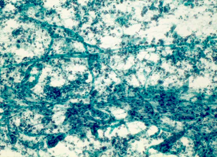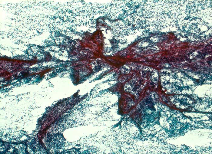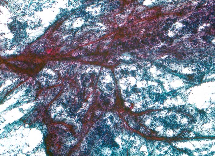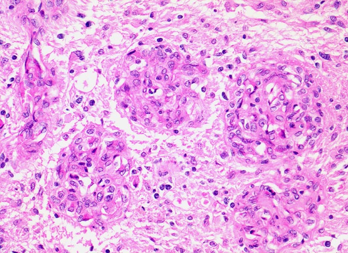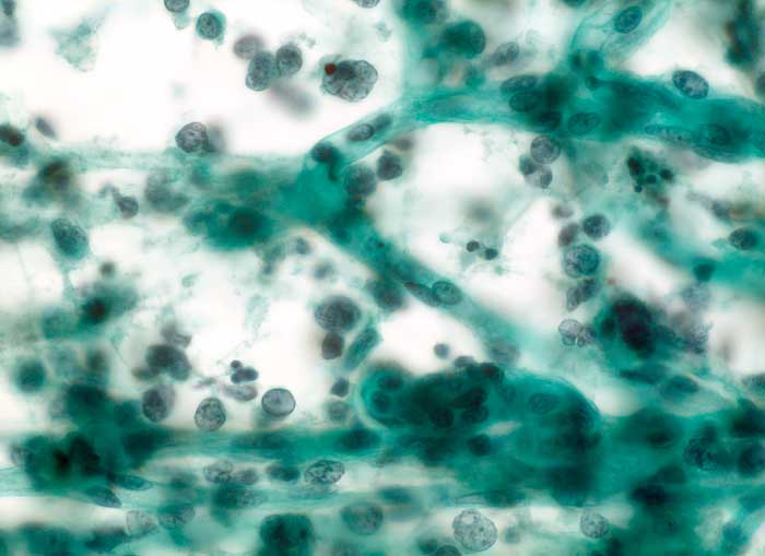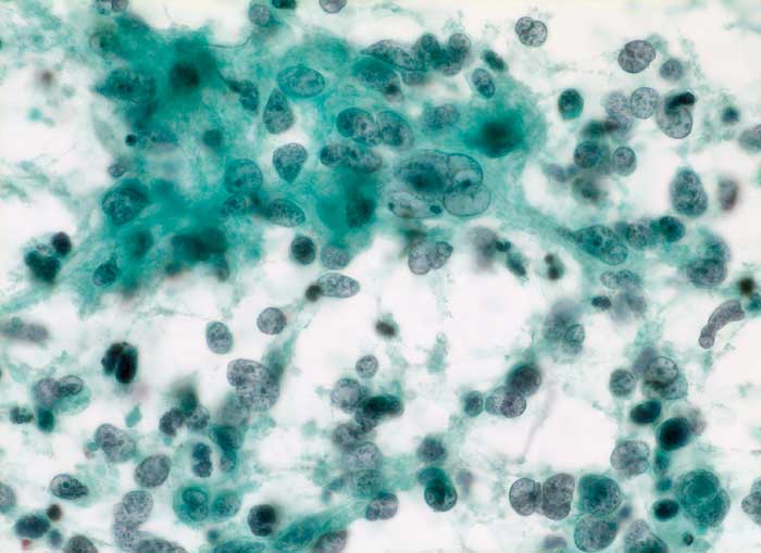 Das zytologische Bild gleicht einem hochmalignen Sarkom. Die Tumorzellen sind oft in mehreren Reihen um eine Kapillarachse herum angeordnet. Das Spektrum reicht von kleinen lymphozytenähnlichen Zellen bis zu grossen zytoplasmareichen und mehrkernigen Zellen. Das Kernchromatin ist grob retikulär und die Kerne sind embryonenartig gebuchtet. Mitosen sind oft anzutreffen. Das Zytoplasma kann degenerativ bedingte Vakuolen enthalten. Den Hintergrund bildet ein Gemisch aus fibrillärer Matrix, Blut, Detritus und Kalkpartikeln.