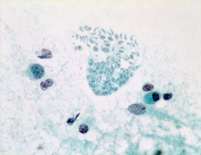 Abstriche von infiziertem Hirngewebe zeigen kleine Gruppen degenerierter glialer Zellen und Histiozyten.