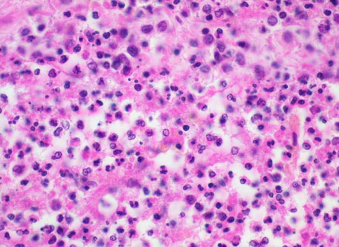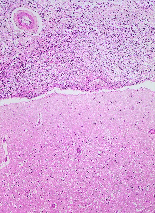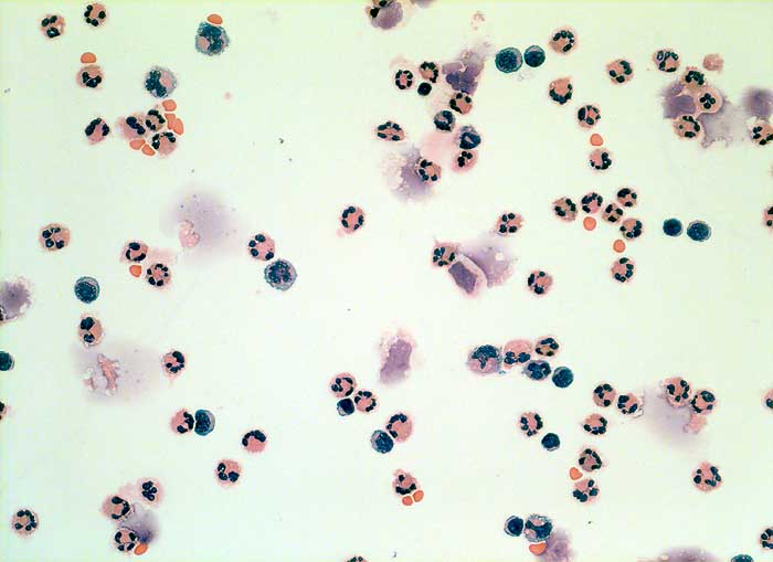 Zytologisch finden sich mehr als 90% neutrophile Granulozyten, ausserdem Fibrin, Makrophagen, degenerierende Zellen, Zelldetritus und manchmal Mikroorganismen. Nach Beginn der Antibiotikatherapie kommt es zu einem raschen Abfall der Zellzahl. Die neutrophilen Granulozyten degenerieren und aktivierte Monozyten beherrschen das Zellbild. Plasmozytoide Lymphozyten und Plasmazellen können dazukommen. In der Reparationsphase verschwinden die Granulozyten, die Anzahl Plasmazellen verringert sich, die Makrophagen sind degeneriert und haben vakuolisiertes Zytoplasma.