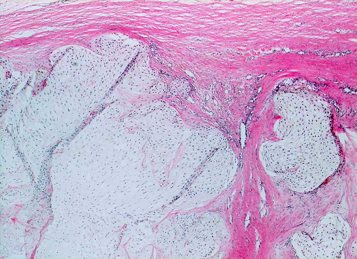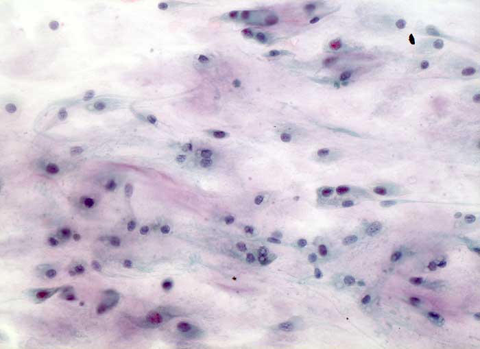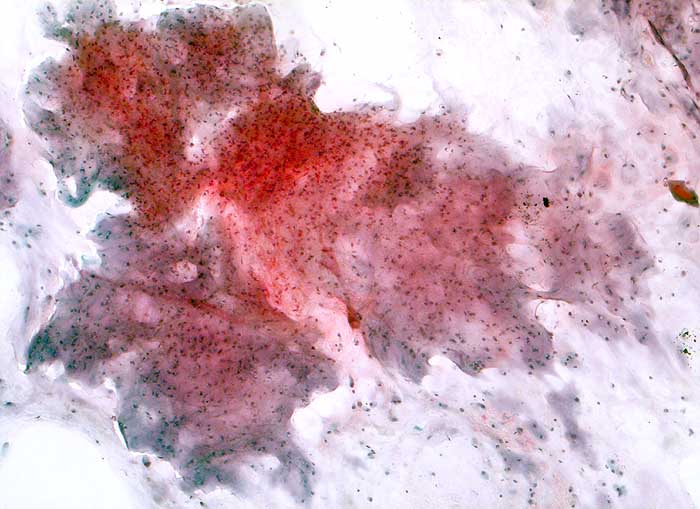 Die Zytologie des Chondrosarkoms ist charakterisiert durch neoplastische Chondrozyten auf einem Hintergrund von chondroider Matrix. Maligne Chondrozyten sind oval oder polygonal. Die Zellen sind locker kohäsiv oder liegen einzeln. Die Tumorzellen sind gelegentlich in Lakunen der hyalinen Matrix eingeschlossen. Vakuolisiertes oder granuläres Zytoplasma ist reichlich vorhanden. Die Kerne sind uniform, rund bis oval und können prominente Nukleolen enthalten. Zellreichtum, Kernatypien, Mehrkernigkeit und Mitosefiguren nehmen zu mit zunehmendem Tumorgrad. Bei den hochmalignen Chondrosarkomen enthalten die zellreichen Ausstriche fast ausschliesslich myxoide Matrix, die sich in der PAP Färbung schwach, in der MGG Färbung deutlich anfärbt. Die verschiedenen Subtypten des Chondrosarkoms sind zytologisch wegen fliessender Übergänge nicht sicher zu unterscheiden. Die Kombination hohes Patientenalter, radiologische Zeichen eines destruktiven Wachstums, hohe Zellularität und Kernpolymorphie lassen bei knorpelbildenden Tumoren auf Malignität schliessen.