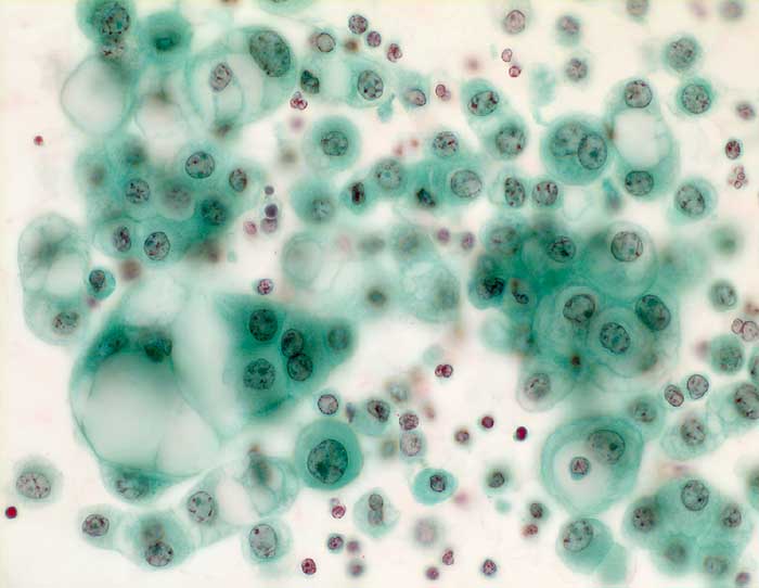 Pankreaskarzinome bilden in Ergüssen kleine Verbände oder liegen einzeln und sind dann schwer von Mesothelien oder Makrophagen unterscheidbar. Ähnlich wie beim Ovarialkarzinom besteht ein gewisser Dimorphismus mit einzelliegenden grossen Zellen mit grob vakuolisiertem Zytoplasma neben kleinen Zellen. Die Tumorzellkerne sind deutlich polymorph bei geringer Grössenschwankung, die atypischen Nukleolen sind gut sichtbar.