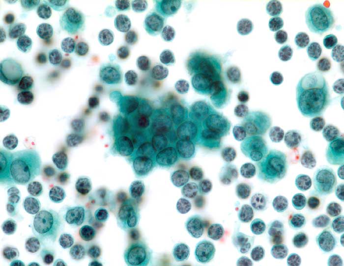 Lobuläre Mammakarzinome sind im Gegensatz zu den invasiv duktalen Karzinomen im Pleuraerguss viel weniger leicht erkennbar. Am häufigsten werden die Zellen des lobulären Karzinoms ganz übersehen oder fehlinterpretiert als Mesothelien oder Lymphomzellen.