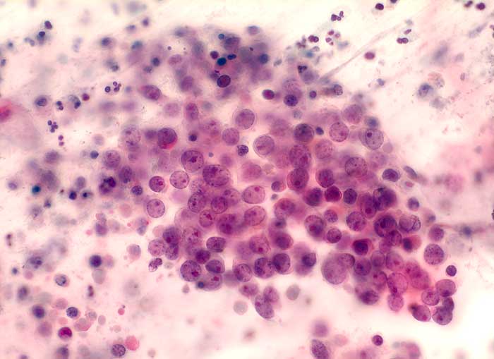 Mammakarzinomzellen im Bronchialsekret liegen oft dicht vermischt mit Flimmerzellen, was auf eine Lymphangiosis carcinomatosa hinweist. Die wenig atypischen Tumorzellen sind dabei kaum von den Zellkernen der Flimmerzellen zu unterscheiden.