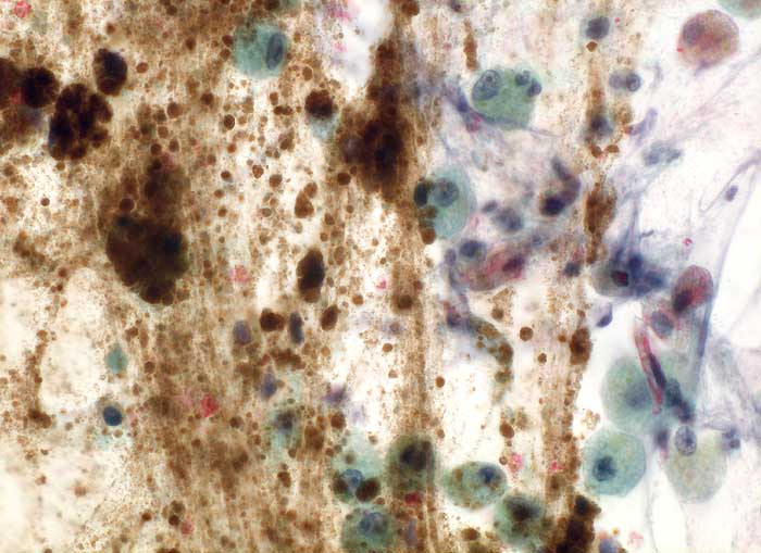 Melanomzellen liegen einzeln oder in pseudoepithelialen Verbänden. Pigmentgranula und plumpe sehr grosse Nukleolen weisen auf das Melanom hin.
