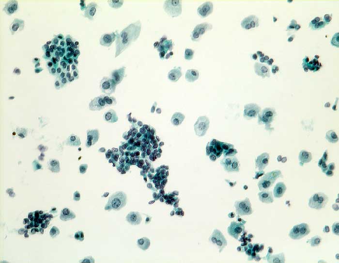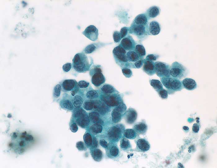 Das Urinsediment ist wie bei den meisten papillären Tumoren zellreich. Die Atypien sind auf den ersten Blick zu sehen. Die Tumorzellen sind deutlich grösser als Basal- und Parabasalzellen. Die Kerne sind polymorph, hyperchromatisch und sehr grob strukturiert. Sie können den lavabrockenähnlichen Kernen des Plattenepithelkarzinoms gleichen. Die Kernmembran ist oft gebuchtet oder grob gebuckelt. Büschel von hochgradig atypischen zylindrischen Urothelien weisen auf die papilläre Struktur des Tumors hin. Blut und Detritus bilden den Ausstrichhintergrund.