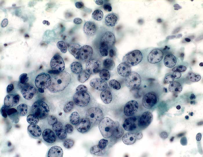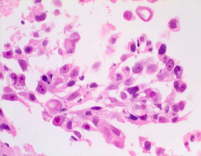 Ein grosszelliges Karzinom wird per exclusionem diagnostiziert, wenn plattenepitheliale, adenomatöse oder andere Differenzierung fehlen. Entsprechend sind weder Verhornung noch Schleimbildung feststellbar. Die Abgrenzung vom wenig differenzierten Adenokarzinom gelingt durch den Nachweis von Sekretvakuolen im Falle eines Adenokarzinoms. Die Kerne können relativ monomorph, aber auch extrem polymorph und ausgesprochen hyperchromatisch sein. Im Unterschied zum kleinzelligen Karzinom sind die Tumorzellen grösser, besitzen einen breiteren Zytoplasmaleib und prominente Nukleolen. Die Tumorzellen liegen einzeln oder in lockeren Verbänden.