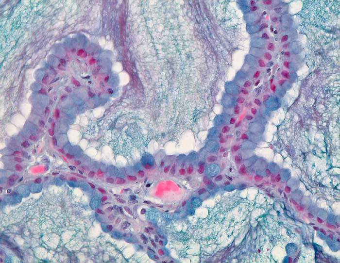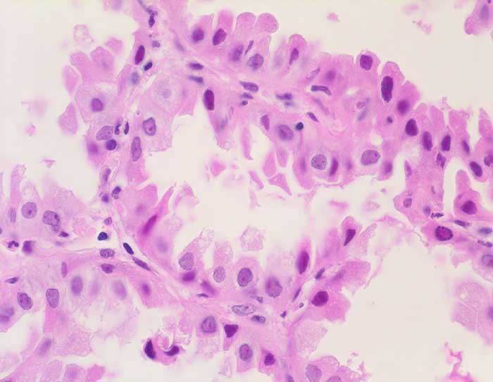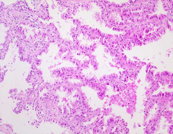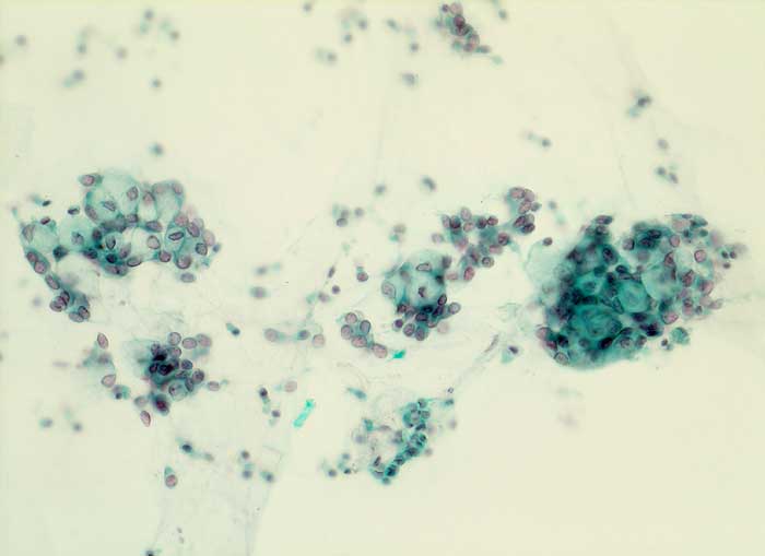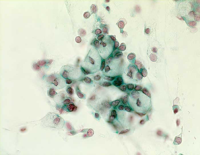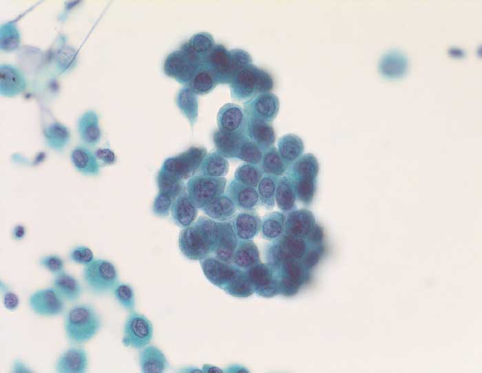 Das Bronchioloalveoläre Karzinom stellt eine Variante des Adenokarzinoms dar. Die Tumorzellen wachsen per Definition auf dem intakten Alveolargerüst, ohne das Stroma zu infiltrieren. Nicht selten zeigen Ausläufer gewöhnlicher Adenokarzinome ein bronchioloalveoläres Wachstumsmuster. Bei diesen Tumoren handelt es sich jedoch nicht um echte bronchioloalveoläre Karzinome. Da eine Invasion zytologisch nicht ausgeschlossen werden kann, ist die zytologische Diagnose eines bronchioloalveolären Karzinoms nicht eindeutig möglich. Die Karzinomzellen schilfern in kleinen Gruppen oder dreidimensionalen Verbänden in die Alveolarlichtungen ab. Multiple kleine papilliforme Zellverbände, die mit Creolakörperchen verwechselt werden können, sind typisch. Im Sputum erscheinen die Tumorzellen kleiner als die der üblichen Adenokarzinome. Die Kerne liegen exzentrisch, sind rund und glatt begrenzt, das Chromatin ist blass. Kernkerben und Pseudoinklusionen sind möglich, Nukleolen sind unauffällig. Das reichlich vorhandene Zytoplasma färbt sich blass eosinophil bis blass zyanophil. Beim muzinösen Subtyp ist es unterschiedlich vakuolisiert. Aufgrund der geringen Kernatypien ist die Unterscheidung von einer Becherzellhyperplasie bisweilen schwierig. Pseudoepitheliale Verbände aktivierter Makrophagen und hyperplastische Alveolarzellen, wie sie bei Lungeninfarkten oder Lungenfibrosen vorkommen verschwinden im Gegensatz zum ähnlich aussehenden bronchioloalveolären Karzinom in wiederholten Sputumkontrollen. Der erste Fall zeigt ein muzinöses, der zweite Fall ein nicht muzinöses bronchioloalveoläres Karzinom.