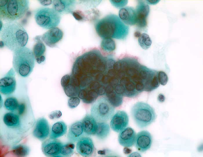Creolakörperchen sind desquamierte abgerundete Verbände hypertrophischer Becher- und Flimmerzellen, die bei Asthmatikern und chronischer Bronchitis beobachtet werden können. Die Kerne sind vergrössert aber nicht atypisch. Die Präsenz von Flimmerhaaren oder einer Cuticula beweist ihre Gutartigkeit. Diese Merkmale sind jedoch nicht immer gut erkennbar und können zu Verwechslungen mit Karzinomzellen führen. Das erste Bild zeigt ein Creolakörperchen neben einem Karzinomzellverband zum Vergleich.