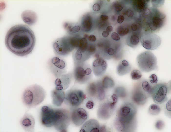 Herpes simplex Viren befallen Plattenepithelien. Sie führen zu typischen milchglasartigen zytoplasmatischen und nukleären Einschlusskörpern in den teils mehrkernigen Plattenepithelzellen. Das Kernchromatin ist in kleinen Klumpen entlang der Kernmembran angeordnet.