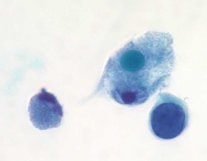 Die Typen BK und JC des Polyomavirus sind für den Menschen pathogen. Das JC Virus verursacht die progressive multifokale Leukenzephalopathie. Das BK Virus persistiert in der Niere, ohne eine manifeste Erkrankung hervorzurufen. Bei Immunsupprimierten kann es zu einer klinisch manifesten Infektion der Nieren kommen. Nukleäre Viruseinschlusskörper finden sich in solchen Fällen im Epithel der Sammelrohre und im Epithel anderer Tubulusabschnitte und im Urothel von Nierenbecken und Ureter. Gehäuft tritt der Niereninfekt unter Immunsuppression mit Tacrolimus auf. Die Urinzytologie stellt die einfachste Nachweismethode dar. Die Polyomavirus-infizierten Decoy-Zellen (=Lockvogelzellen wegen Verwechslungsmöglichkeit mit atypischen Zellen) enthalten einen milchglasartigen Kern. Das Chromatin ist grobschollig und and die Kernmembran gedrängt. Bei drohender Transplantatabstossung ist zusätzlich die Zahl der tubulären Zellen im Urin deutlich erhöht.