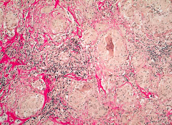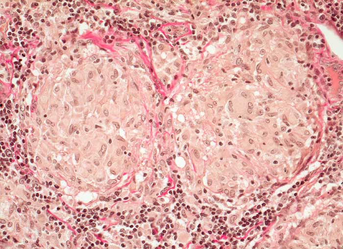 Im Unterschied zur Tuberkulose weisen die Epitheloidzellen bei Sarkoidose einen breiten Zytoplasmasaum und nicht immer schuhsohlenförmige, sondern auch vesikuläre oder abgerundete Kerne auf. Die Epitheloidzellen sind deshalb leicht mit Epithelien zu verwechseln.
