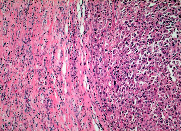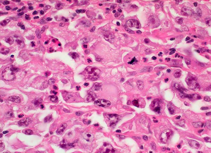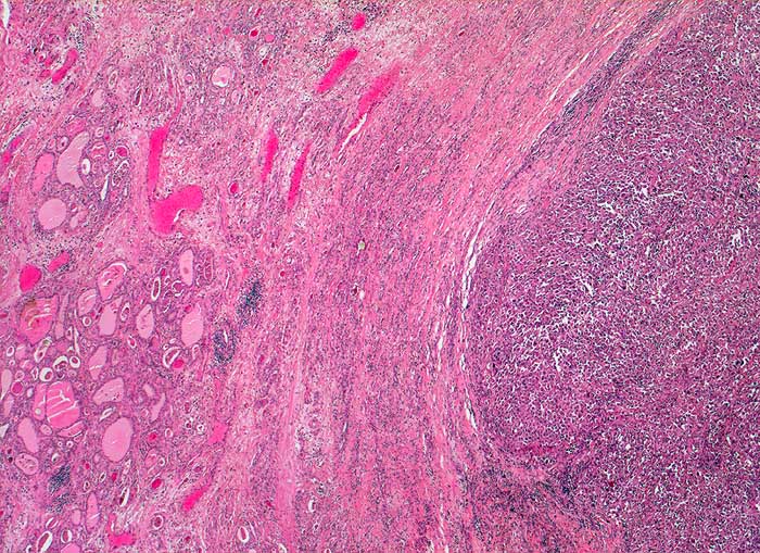 Abstriche von anaplastischen Karzinomen sind gewöhnlich sehr zellreich ausser bei ausgeprägter Desmoplasie. Die Grösse und die Form der Tumorzellen ist äusserst variabel. Oft finden sich sehr grosse, bizarre und spindelförmige Zellen. Die Kerne weisen offensichtliche Zeichen der Malignität auf: irreguläre Kernmembran, grobes dunkles Chromatin und Makronukleolen. Mitosen, auch atypische, sind häufig. Das Zytoplasma variiert von blass und vakuolisiert über granulär bis dicht. Nekrosen, neutrophile Granulozyten und eine Tumordiathese im Hintergrund sind typisch. Die Tumoren exprimieren Vimentin und Zytokeratine, sind aber negativ für Thyreoglobulin und TTF1 (Thyroid Transcription Factor).