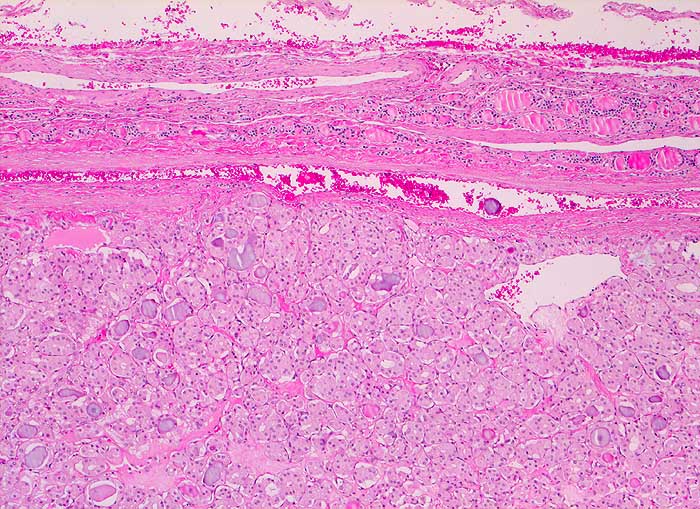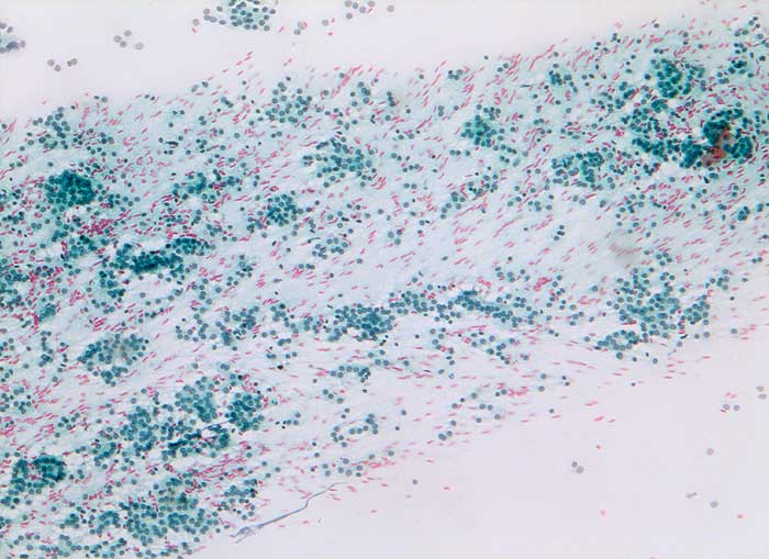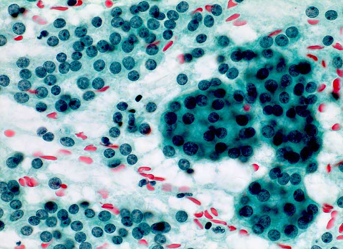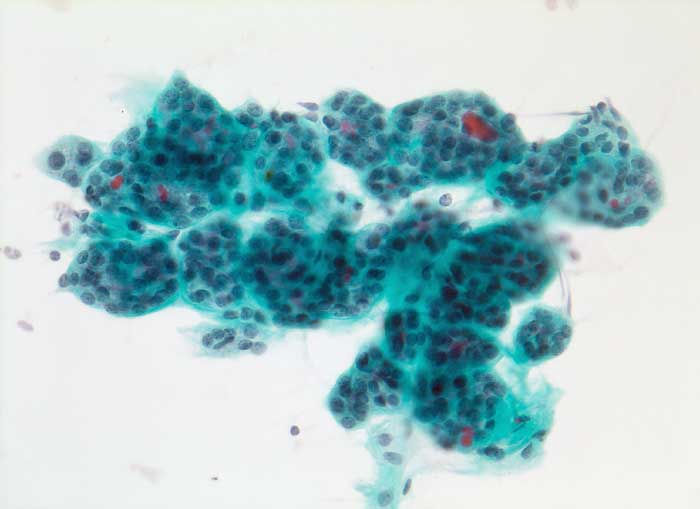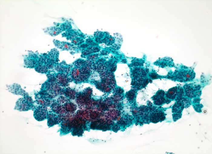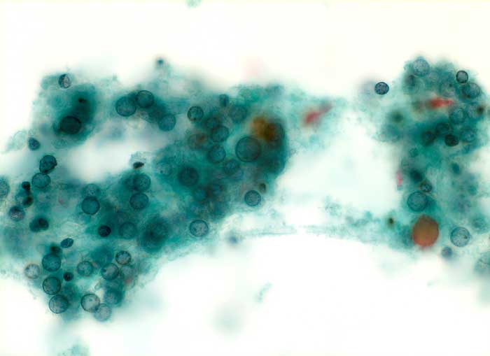 Punktate aus mikrofollikulären oder trabekulären Adenomen sind zellreich und kolloidarm. Die Thyreozyten bilden oft Mikrofollikel oder kleine Rosetten, die eosinophile Kolloidtropfen umschliessen. Die Kerne sind gleichförmig rund, fein granuliert und zeigen keine Atypien. Gelegentlich finden sich regressive Veränderungen. Zytologisch sind follikuläre Adenome und hoch differenzierte follikuläre Karzinome nur schwer zu unterscheiden. Aus diesem Grund werden beide Läsionen mit dem Begriff "follikuläre Neoplasie" bezeichnet. Unten sind zwei Beispiele von mikrofollikulären Adenomen abgebildet.