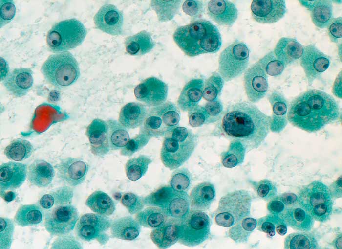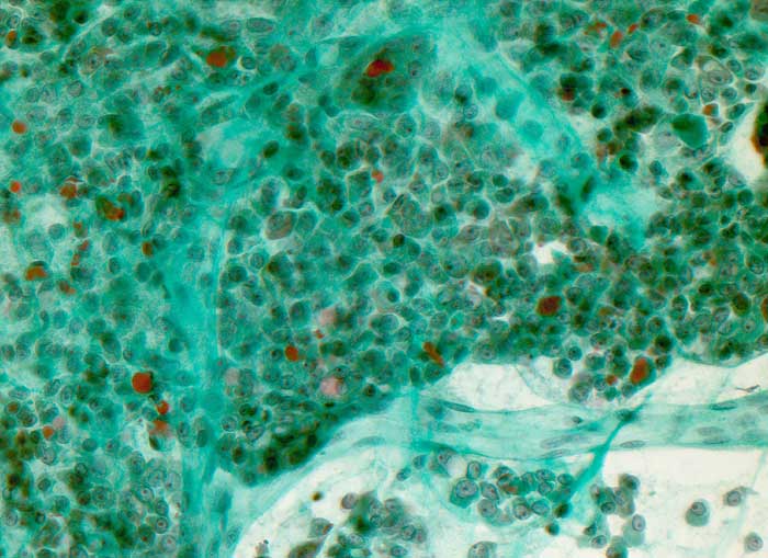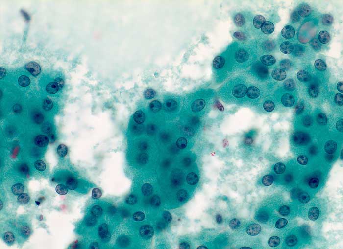 Ausgeprägte Kernpolymorphie, Nukleolenatypie und unscharfe Zytoplasmagrenzen der oxyphilen Zellen sind Malignitätszeichen. Eine Unterscheidung von onkozytären Adenomen und Karzinomen ist zytologisch aber nicht sicher möglich. Gezeigt werden zwei Fälle von histologisch gesicherten onkozytären Karzinomen.