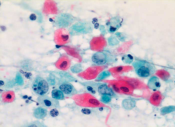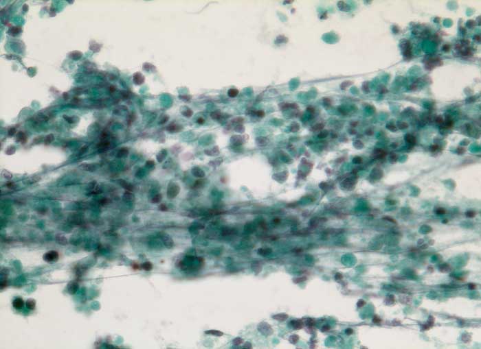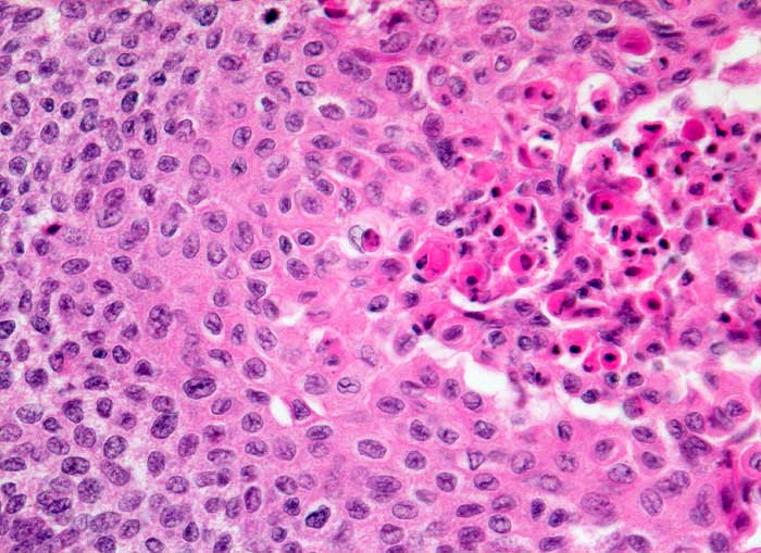 Zervikale Lymphknotenmetastasen eines Plattenepithelkarzinoms stammen oft von Primärtumoren aus dem HNO Bereich. Diese sind im Unterschied zu den Plattenepithelkarzinomen der Lunge, die ebenfalls in die Halslymphknoten metastasieren, meist hoch differenziert, stark verhornend und ausgedehnt nekrotisch.