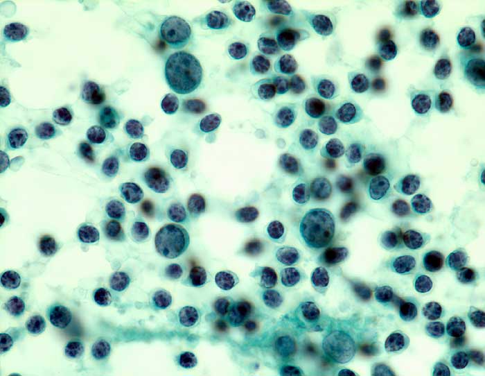 Ein buntes Zellbild ist typisch für die reaktive hyperplastische Lymphadenitis. Neben kleinen Lymphozyten sind viele Zentrozyten und Zentroblasten aus aktivierten Keimzentren, sowie Kerntrümmermakrophagen nachweisbar. Letztere beweisen keinesfalls die Gutartigkeit der Veränderung. Daneben findet man auch neutrophile Granulozyten und Plasmazellen.