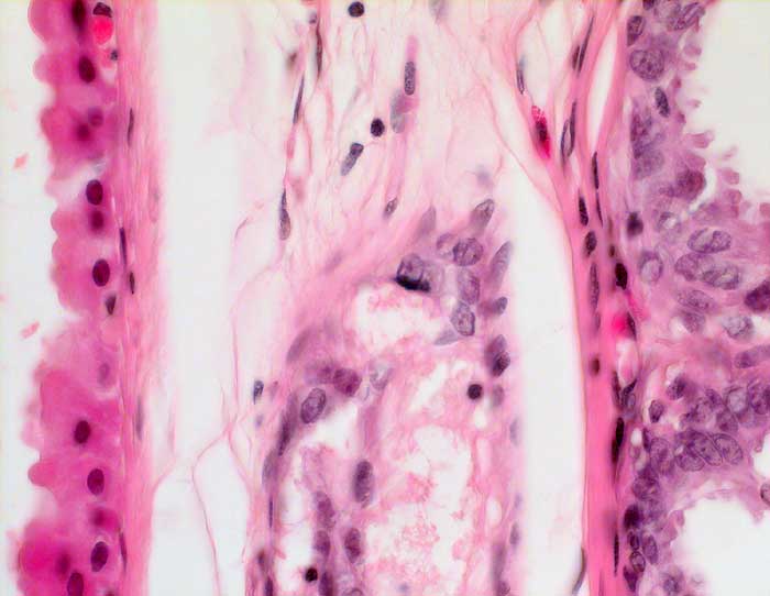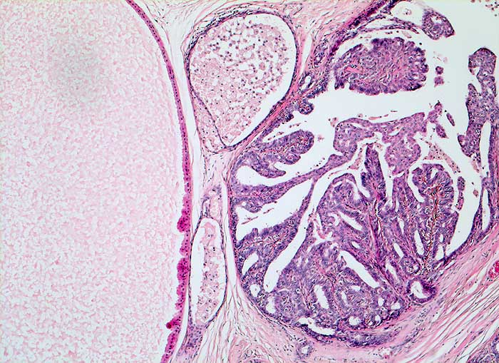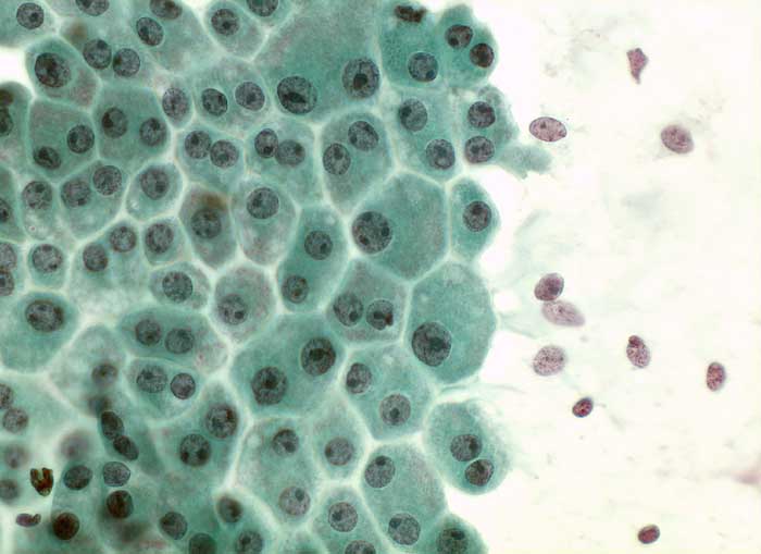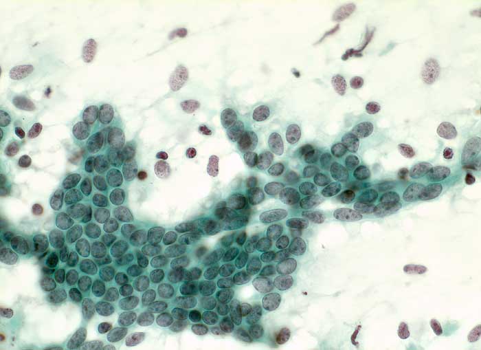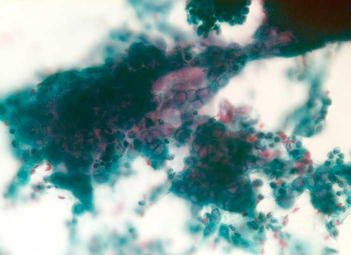 Entsprechend dem heterogenen histologischen Bild ist auch der zytologische Befund sehr variabel. Bei Überwiegen der Fibrose sind die Ausstriche zellarm, bei Überwiegen der intraduktalen Epithelhyperplasie entsprechend zellreich. Die Ausstriche enthalten in diesem Fall zuweilen verzweigte Verbände duktaler Epithelien, Azinuszellen, apokrine Zellen und bipolare Myoepithelien. Apokrin metaplastische Zellen sind erkennbar an ihrem breiten eosinophil bis zyanophil granulierten Zytoplasma und den grossen, auffallend grob strukturierten Kernen mit prominentem zentralem Nukleolus. Zystenpunktate enthalten Schaumzellen, histiozytäre Riesenzellen, pseudoepitheliale Makrophagenverbände, kernlose Zellschatten von Makrophagen und Detritus. Zusätzlich können neutrophile Granulozyten oder Hämosiderin speichernde Makrophagen vorhanden sein.