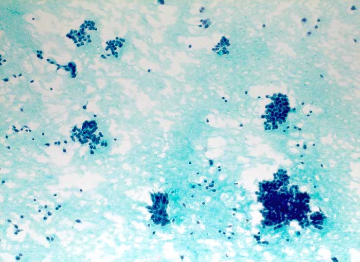 Das DCIS zeigt im Gegensatz zur atypischen Hyperplasie eher diskohäsive Verbände und Einzelzellen. Bei der atypischen Hyperplasie sind gutartige Zellelemente beigemischt und die Verbände können irreguläre oder schlitzartige Lumina enthalten.