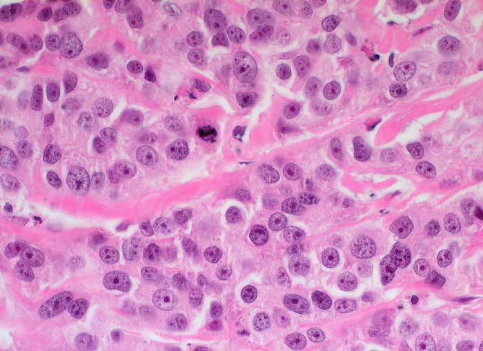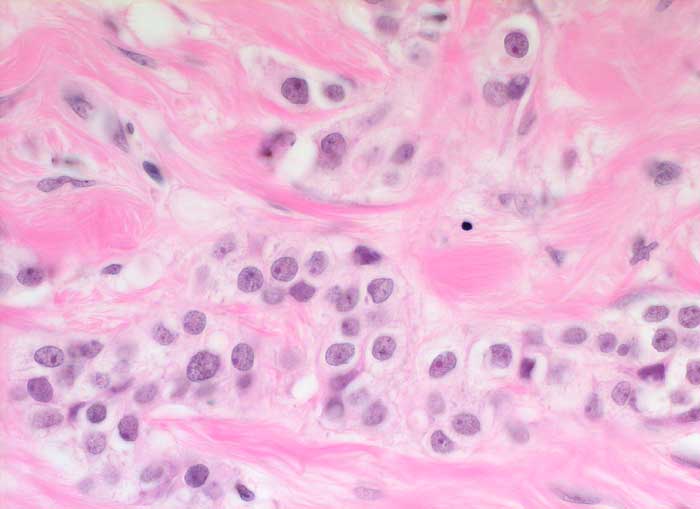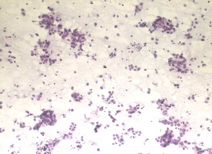 Das invasive Mammakarzinom zeigt zytologisch eine homogene Population maligner Zellen. Typischerweise sollten die Ausstriche zellreich sein und alle vorhandenen Zellen sollten maligne aussehen. Wenn man atypische Zellen suchen muss, ist der Ausstrich nicht diagnostisch für ein Karzinom, kann aber gleichwohl verdächtig sein. Die malignen Zellen sind in lockeren Gruppen gelagert und viele liegen einzeln. Crowding, Zellkannibalismus und Kernmolding sind gute Hinweise auf Malignität. Myoepithelien sind meistens aber nicht immer abwesend. Mammakarzinomzellen sind eher monomorph und deutlich grösser als normale duktale Epithelien. Zellkerne, die grösser sind als zwei Erythrozytendurchmesser, sind tumorverdächtig. Fast immer sind Kerbungen der Zellmembran nachweisbar. Das Chromatin ist im Gegensatz zu anderen Adenokarzinomen fein granulär und gleichmässig im Kern verteilt. Nukleolen sind meist unscheinbar. Makronukleolen sprechen für ein invasives Karzinom. Die Kohäsivität ist das wichtigste Kriterium zur Feststellung des Differenzierungsgrades. Bei hoch differenzierten Karzinomen finden sich Verbände, bei wenig differenzierten liegen die Tumorzellen vermehrt einzeln. Wenig differenzierte Karzinome zeigen gesteigerte Kernatypien und der Hintergrund ist eher detritisch aufgrund ausgedehnter Tumornekrosen.