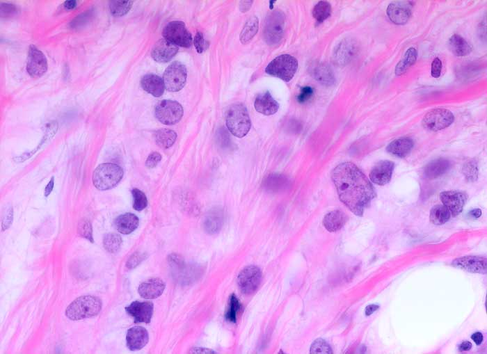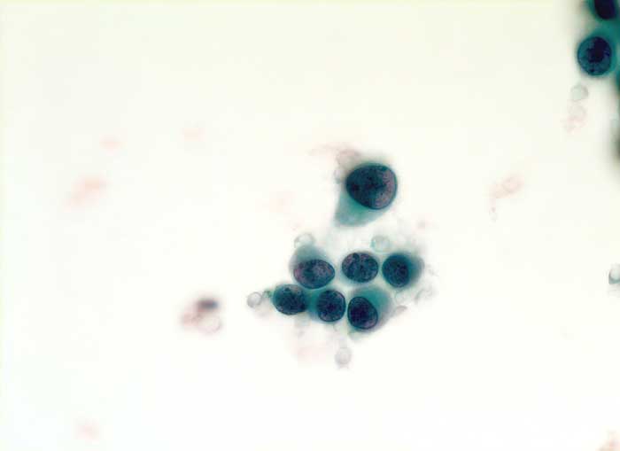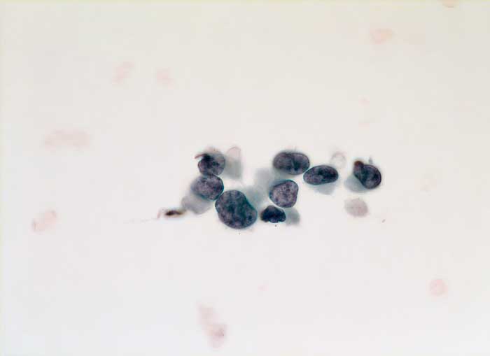 Die Ausstriche der invasiven lobulären Karzinome sind meist zellarm (ausgeprägte Desmoplasie). Die monomorphen Tumorzellen sind kaum grösser als normale duktale Epithelien. Die exzentrisch gelagerten Kerne sind rundlich und nur wenig atypisch. Nukleolen sind selten zu sehen. Das Zytoplasma enthält manchmal eine Vakuole, die den Kern einbuchtet und der Zelle einen Siegelringaspekt verleiht. Bei diesen Zytoplasmaeinschlüssen handelt es sich aber nicht um Schleimvakuolen, sondern um Zisternen. Die Tumorzellen liegen einzeln, in losen Gruppen oder bilden zeilenförmige Verbände („indian files“). Aufgrund des geringen Zellgehaltes und der gering ausgeprägten Zellatypien ist die Diagnose des lobulären Karzinoms am zytologischen Ausstrich schwierig. Invasive Karzinome vom lobulären und duktalen Typ sind zytologisch schwierig zu unterscheiden. Der Tumorsubtyp wird deshalb in der Regel in der Diagnose nicht angegeben.