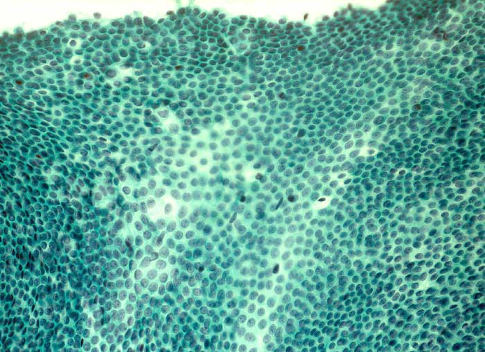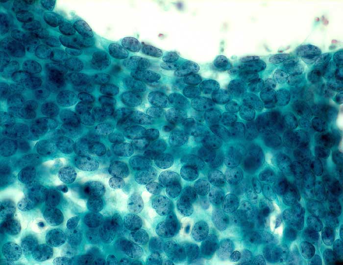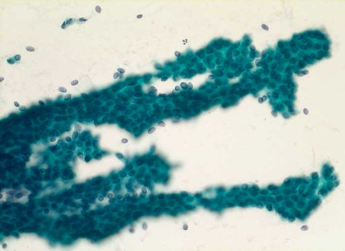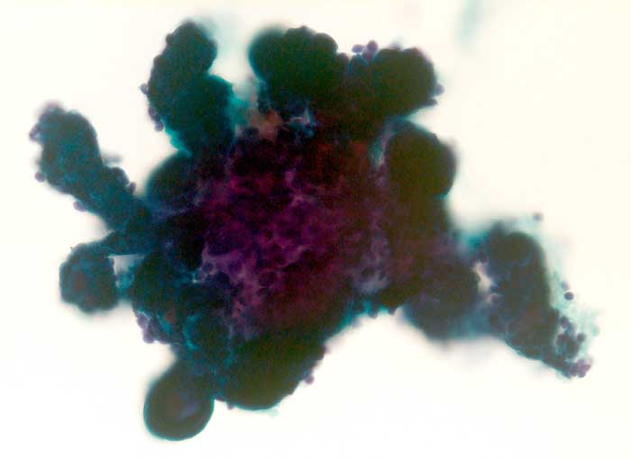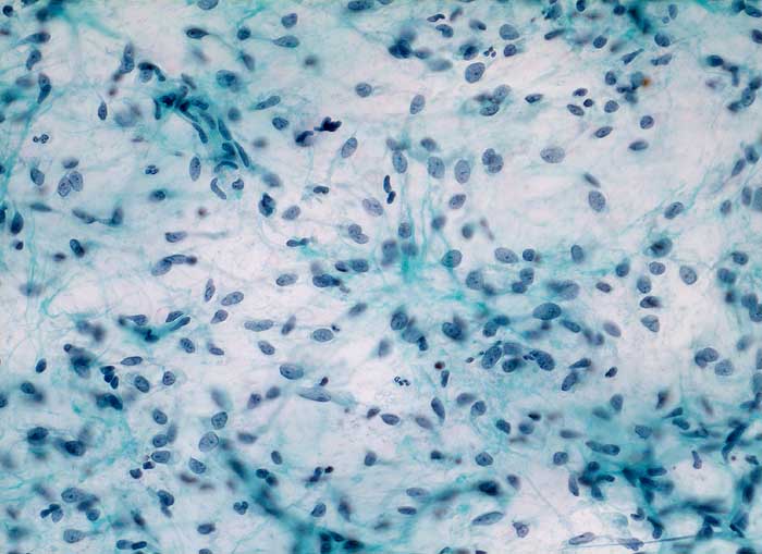 Grosse Mengen epithelialer Zellen, bipolarer Nacktkerne (Myofibroblasten und Fibrozyten) und scharf begrenzte Stromafragmente charakterisieren das Fibroadenom zytologisch. Aspirate von stark fibrosierten Fibroadenomen können auch zellarm sein. Einseitig von Epithel bedeckte Bindegewebsfragmente sprechen für ein Fibroadenom. Durch die Aspiration wird die epitheliale Innenauskleidung mit ihren Verzweigungen aus dem Gangsystem gelöst. Die Epithelverbände sind beim intrakanalikulären Fibroadenom flach und erscheinen beim perikanalikulären Fibroadenom T-, Y-, finger- oder hirschgeweihförmig. Die Kerne sind wenig grösser als die Kerne normaler duktaler Epithelien und messen meist weniger als zwei Erythrozytendurchmesser. Da es sich bei Fibroadenomen um proliferierende Läsionen handelt können die Epithelzellen Zeichen der Aktivierung zeigen in Form einer mässig ausgeprägten Pleomorphie, prominenten Nukleolen, und gelegentlichen Mitosen. Das erste Beispiel zeigt ein intrakanalikuläres, das zweite Beispiel ein perikanalikuläres Fibroadenom mit stark verzweigten Zellverbänden. Das dritte Beispiel zeigt die Zytomorphologie eines Fibroadenoms mit stark aktivierten Zellen.