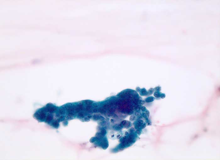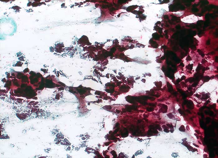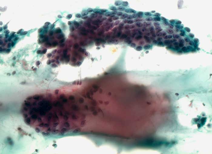 Homogene oder schlierenförmige extrazelluläre Schleimmassen mit Inseln von Tumorzellen mit geringen Kernatypien sind pathognomonisch für das muzinöse Mammakarzinom. Die Zellzahl ist meist nicht sehr hoch. Die Zellen liegen einzeln oder in kleinen kugeligen oder pseudopapillären Verbänden. Der Schleim erscheint in der Pap Färbung blau-grau bis rötlich. Siegelringkarzinome zeigen grössere intrazytoplasmatische Schleimvakuolen. Unten werden zwei Beispiele von typischen muzinösen Karzinomen gezeigt.